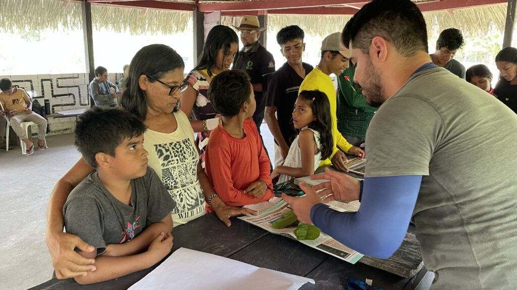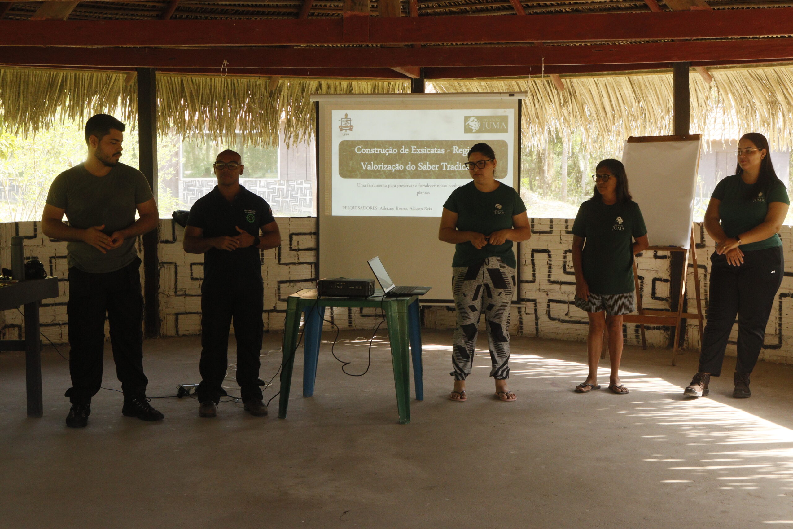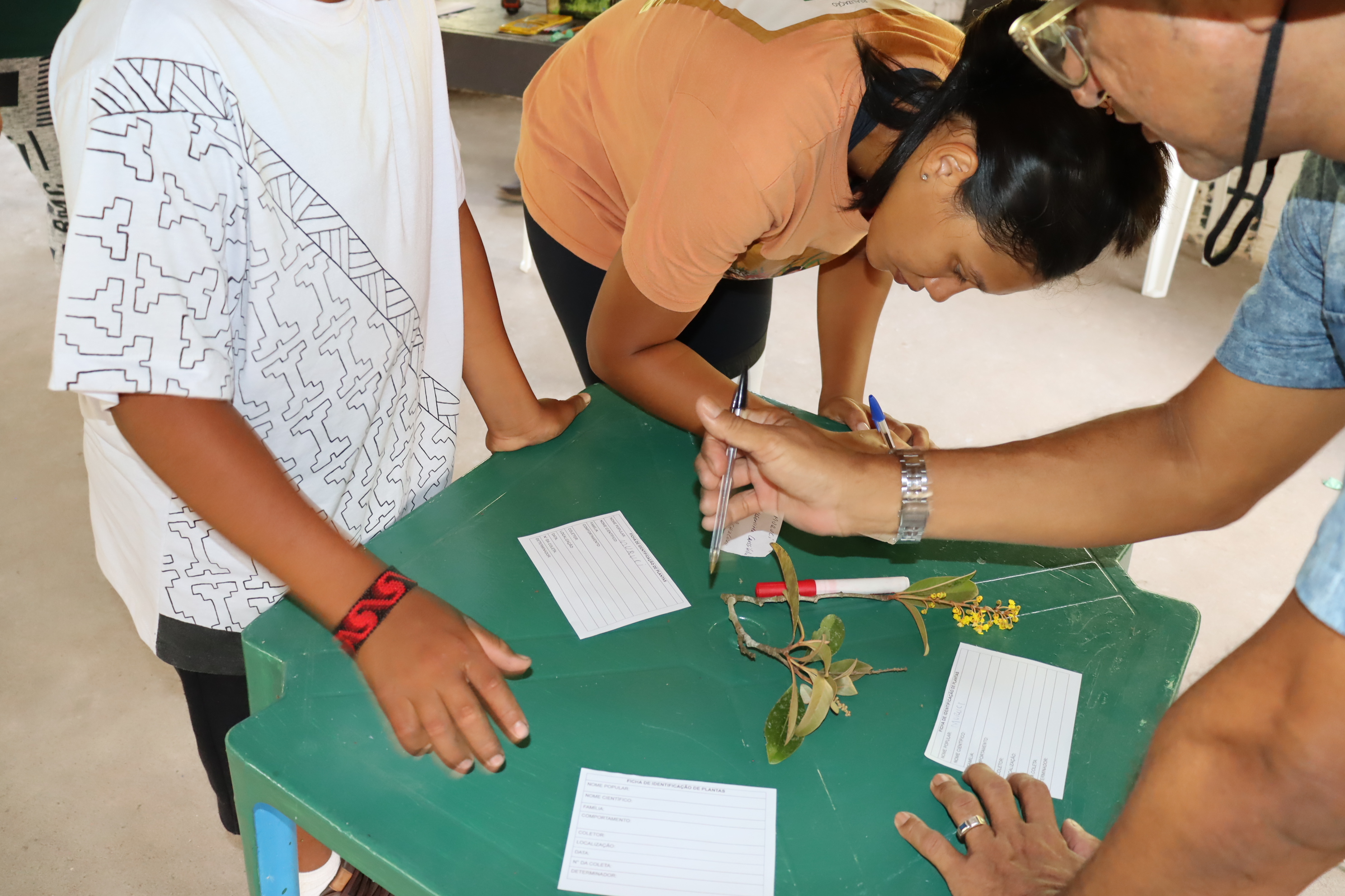 On the first day, the program included an introduction to the importance of botanical identification, a presentation of species recognition techniques, and practices on the preparation of plant specimens for herbarium formation. During the following two days, field activities took place along Kaarimã Village’s ecological trail, focusing on recognizing medicinal plants and promoting hands-on learning in direct contact with the forest.