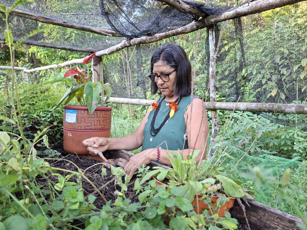 Maria Lúcia Xipaya, president of the Juma Institute, planting medicinal herbs in the Kaarimã village, TI Xipaya