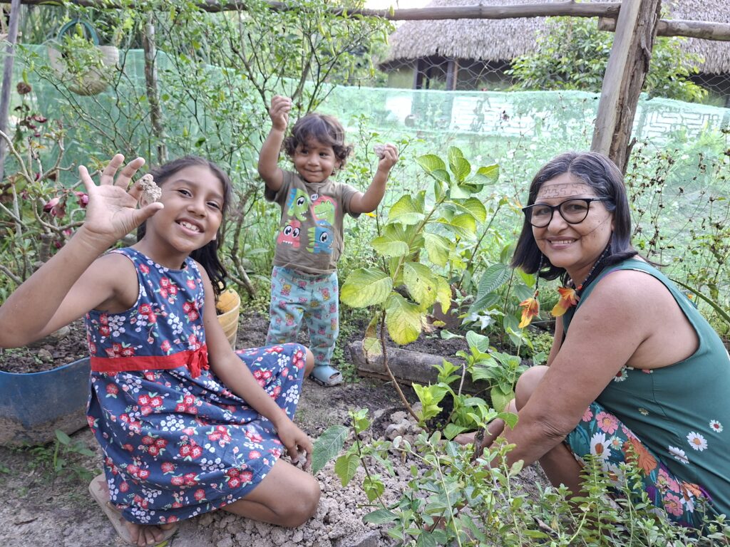 Maria Lúcia Xipaya teaching her grandchildren about growing plants